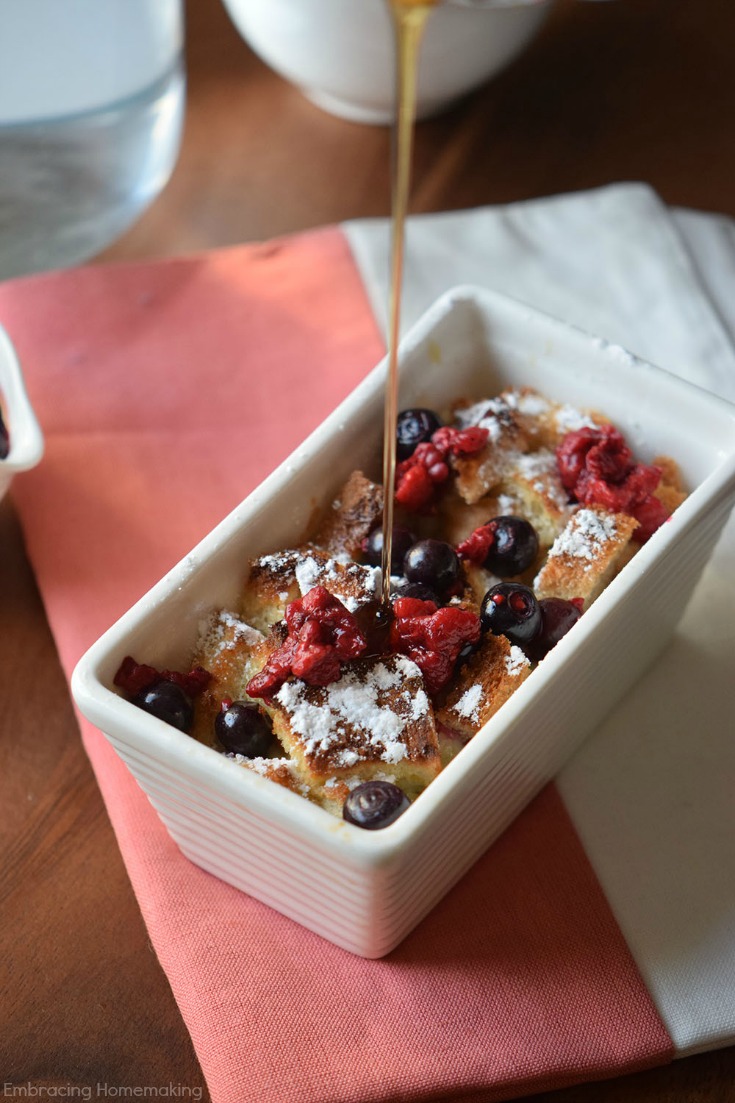 Once your casserole is full with french toast, you can pour the remaining mixture on top and take it to the oven as it is or add some toppings. I prefer to bake them with the toppings, basically because I like how the toppings get more delicious with a little bit of oven time. So sprinkle on some powdered sugar, throw your toppings on (I used a frozen berry mix), and bake it for 40 minutes.