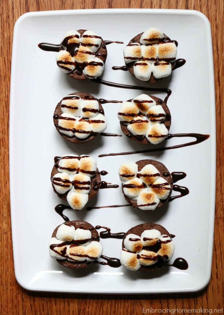 Hot Chocolate Brownie Bites! They’re delicious and there’s not really much to them. Make mini brownie bites (or buy them!). I made these and had them in my freezer so I had to thaw them a while. I threw a few marshmallows on each one and popped them into our toaster oven on broil. It only took a few minutes before they were golden brown. I topped them with Hershey’s Simply 5 Syrup and voila! Delicious hot chocolate brownie bites!