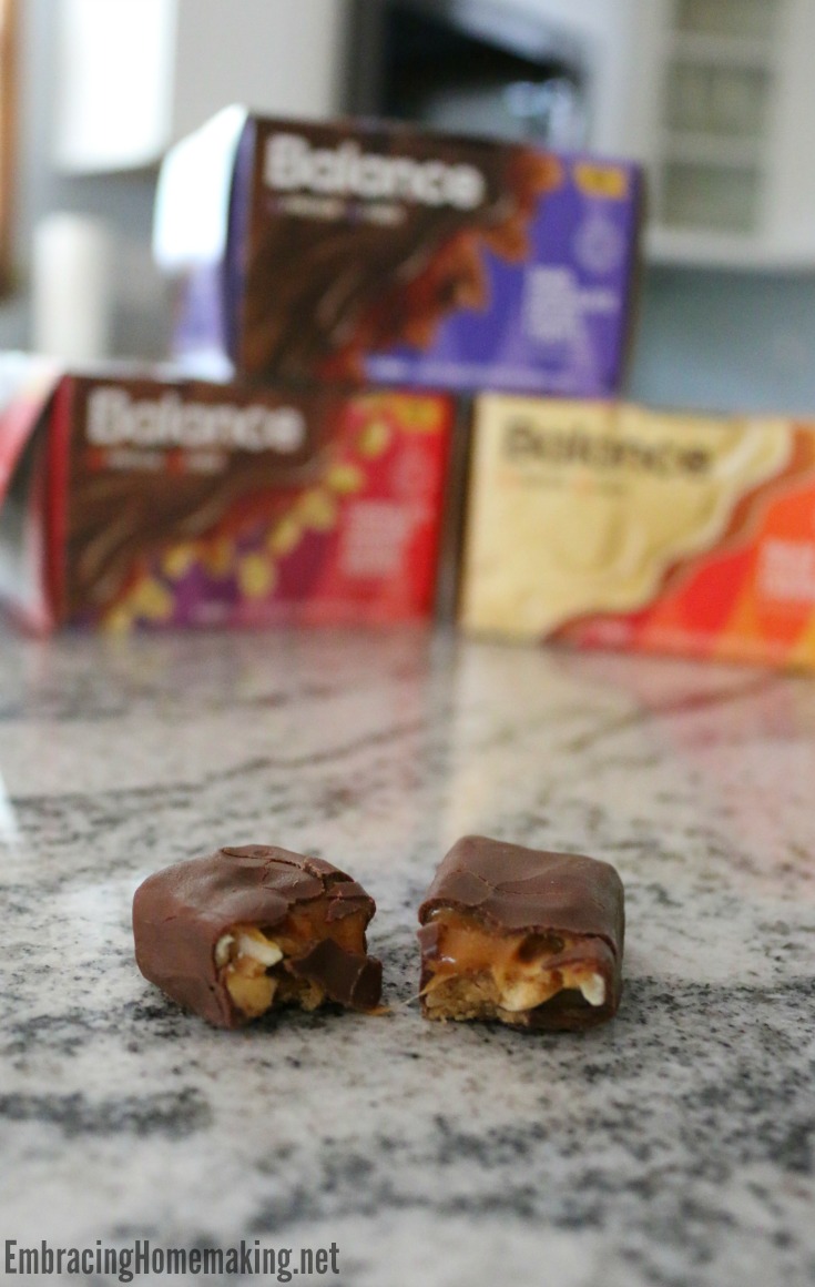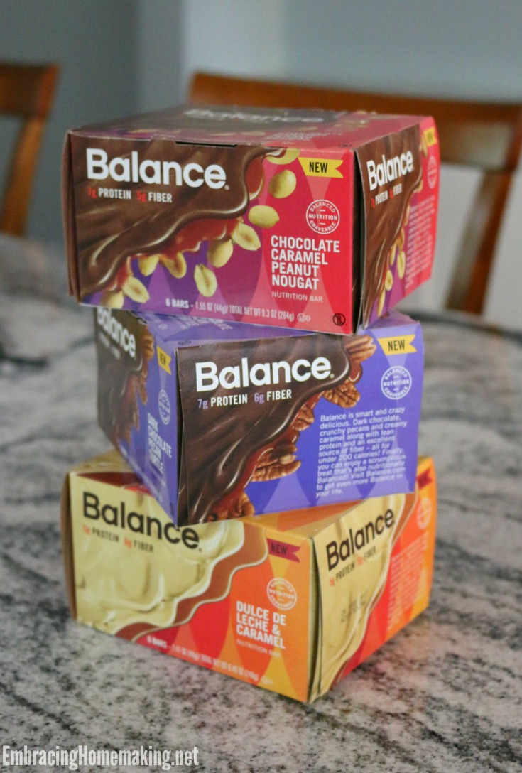 Balance bars! They are a nutritional snack bar that is a great balance of yumminess and energizing ingredients. They’re perfect to help me feel full without feeling guilty. I don’t have to be afraid to indulge with around 190 calories, 5-7 grams of protein, and 5-6 grams of fiber. Balance has four delicious new flavors including Chocolate Peppermint Patty, Dark Chocolate Pecan Turtle, Dulce De Leche & Caramel, and my favorite Chocolate Caramel Peanut Nougat. Balance just released this new colorful packaging that features the original flavors in full-size bars and new flavors in two mini bars. Balance bars allow me to snack smarter…in a balanced way if you will.