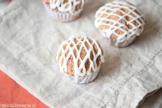 And then there’s the topping. Oh my, the topping that coats the muffins tastes delicious. It’s sweet, it’s a bit crunchy, and it’s a total crowd pleaser. I just mix some milk, powdered sugar, and a pinch of vanilla extract and then is just a matter of filling a piping bag and decorating.