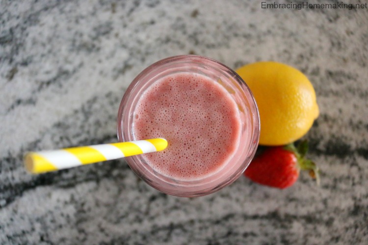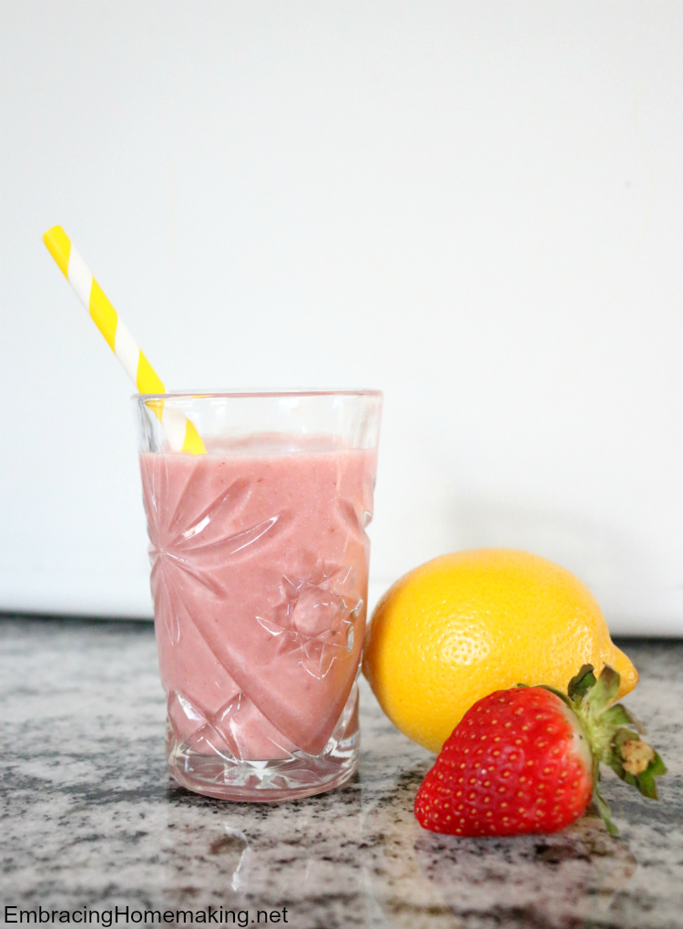 Smoothies are a sweet and delicious treat that’s great for kids of all ages! Instead of ice cream or candy, smoothies are our go to treat around here. Sometimes something more indulgent is needed like frozen yogurt with five different toppings but most days, a smoothie hits the sweet spot! Especially when your smoothie is chock-full of strawberries and lemons!!