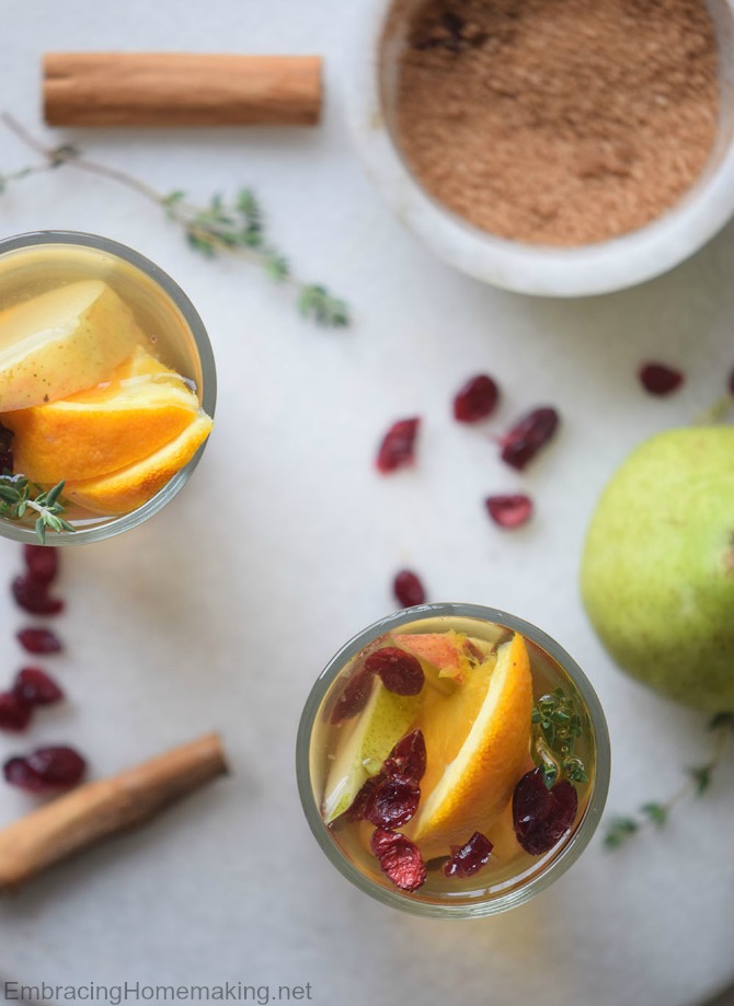 - -Add the apple slices, orange slices, pear slices, cranberries, and thyme sprigs to the glasses. Pour the apple cider into the glasses.