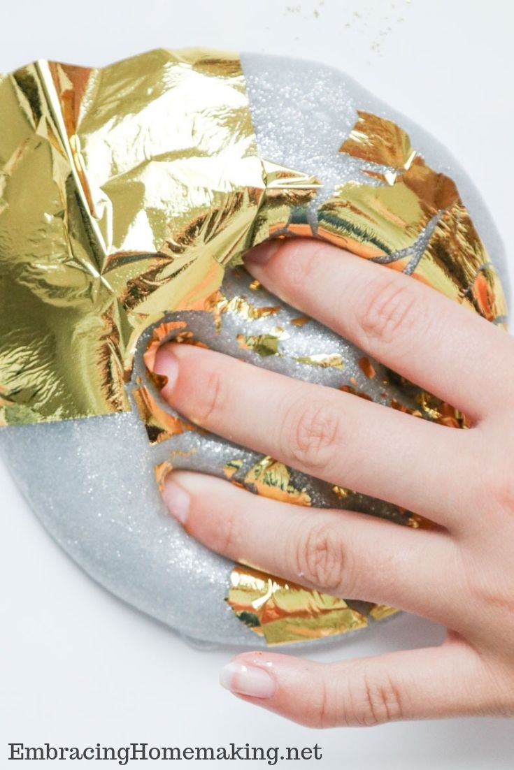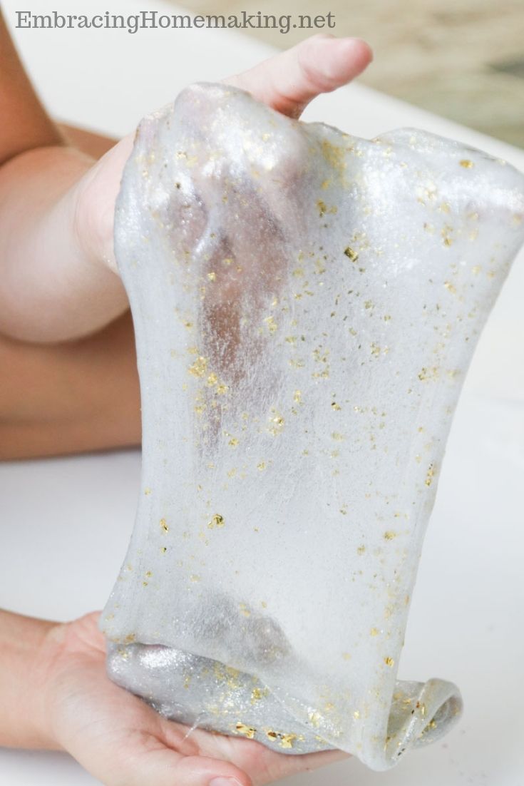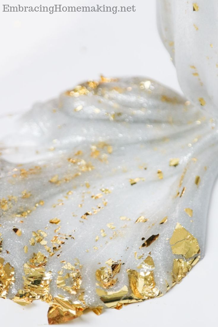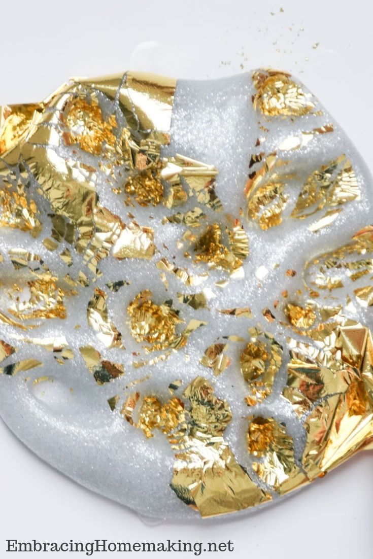 Now that you’ve read a little bit about how this silver glue and gold foil slime can be a fun science and chemistry learning experiment, it’s time to follow the instructions below to make your own batch of silver glue and gold foil slime today.