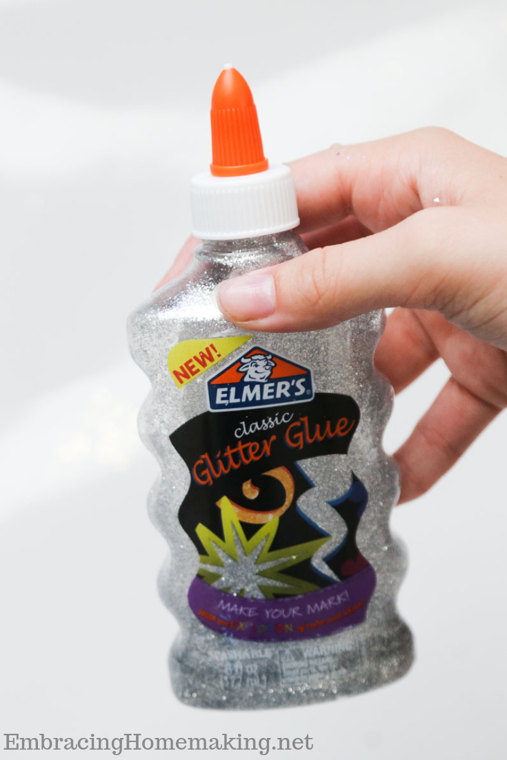 - – Elmer’s Classic Glitter Glue. I bought mine from a local craft store but found the Elmer’s Silver Glitter Glue cheaper on Amazon right now. Keep in mind Amazon prices often fluctuate but it’s at a steal of a price right now.