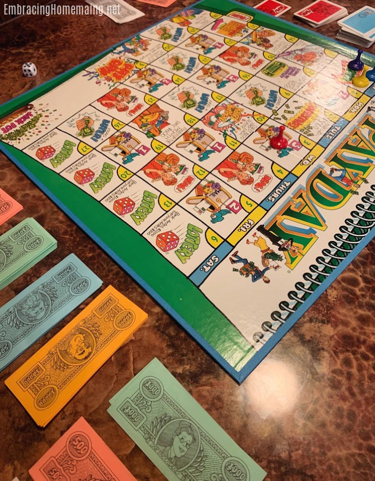- – Pay Day – This is also an oldie but goodie! While it does teach that debt is good (sorry, Dave Ramsey!) it does make kids add and subtract large numbers. Plus, you can also use it to teach kids how to count money back to someone. It’s a game our whole family loves. It’s mostly the luck of the dice along with some decisions that could sway the game. It’s a keeper! I have the version my parents owned but I recently gifted a newer version and it’s very very similar. I’m thankful that they didn’t update it like some other games have done. If you don’t already own it you can check out both versions on Amazon. Here’s the retro version and the newer version.