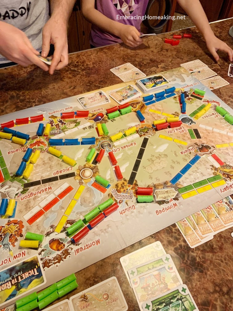 - – Ticket to Ride First Journey – This is based on the award winning game, Ticket to Ride. 2-4 players use cards to help make their way across America. My kids have learned about different destinations and have enjoyed forming different strategies to win. You’re supposed to hold your cards up to keep others from seeing but when we started this a year ago we played for many months with them down while helping each other make their best path possible. (Forgive the bad pictures. We often play games in our basement and it’s dark and decorated in 70’s decor. 🙂 Also, I’m realizing while taking these pictures that I play most games upside down. How did that happen? lol) You can also find this game on Amazon too.