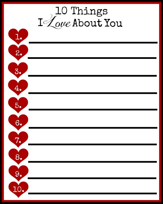This Valentine printable is unlike the other ones we’ve shared so far and I think it’s a good kind of different. The others were simple and cutesy printables that you, well, print and leave for your Valentine to find. This one requires that you stop for a few minutes and write out ten things you love about the person you’re giving the note to.